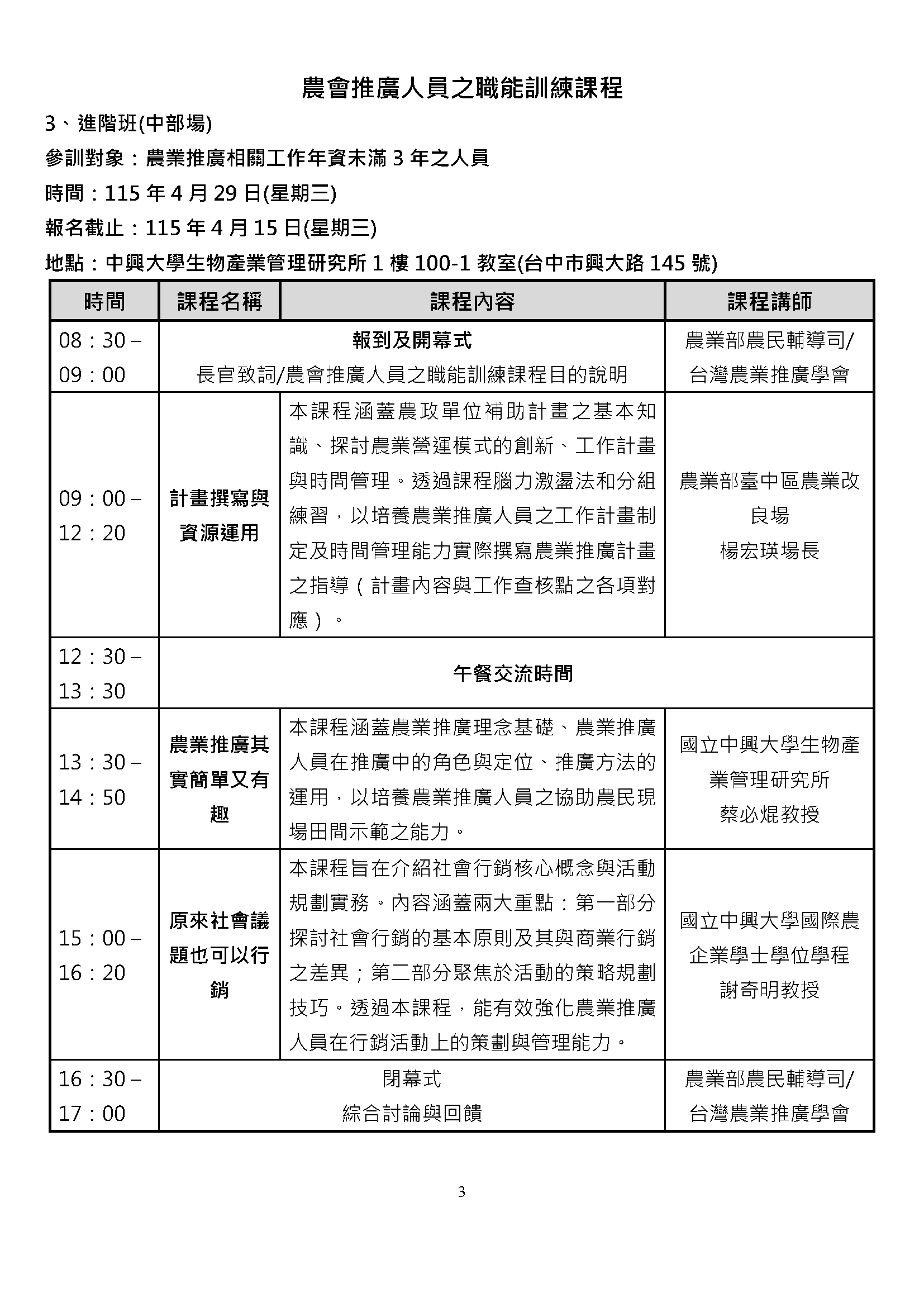115年度「農會推廣人員之職能訓練課程」進階班1(中部場)