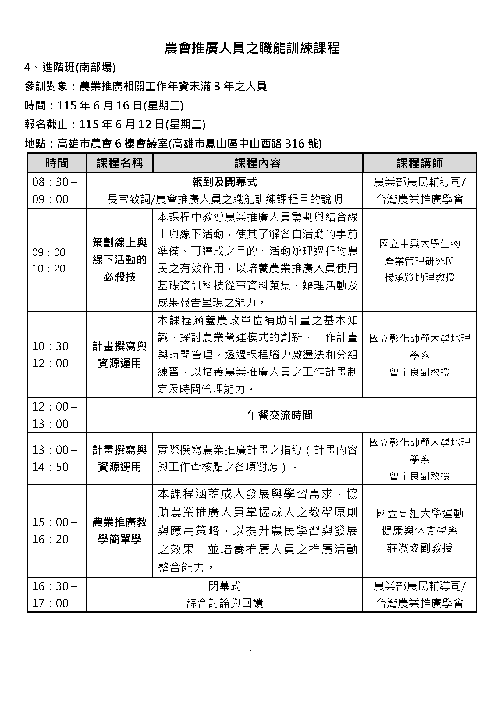 115年度「農會推廣人員之職能訓練課程」進階班2(南部場)